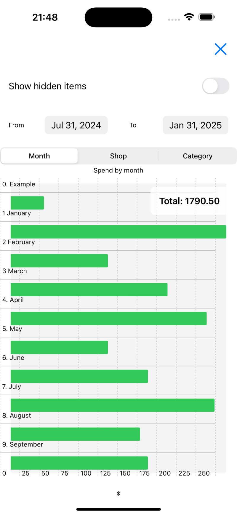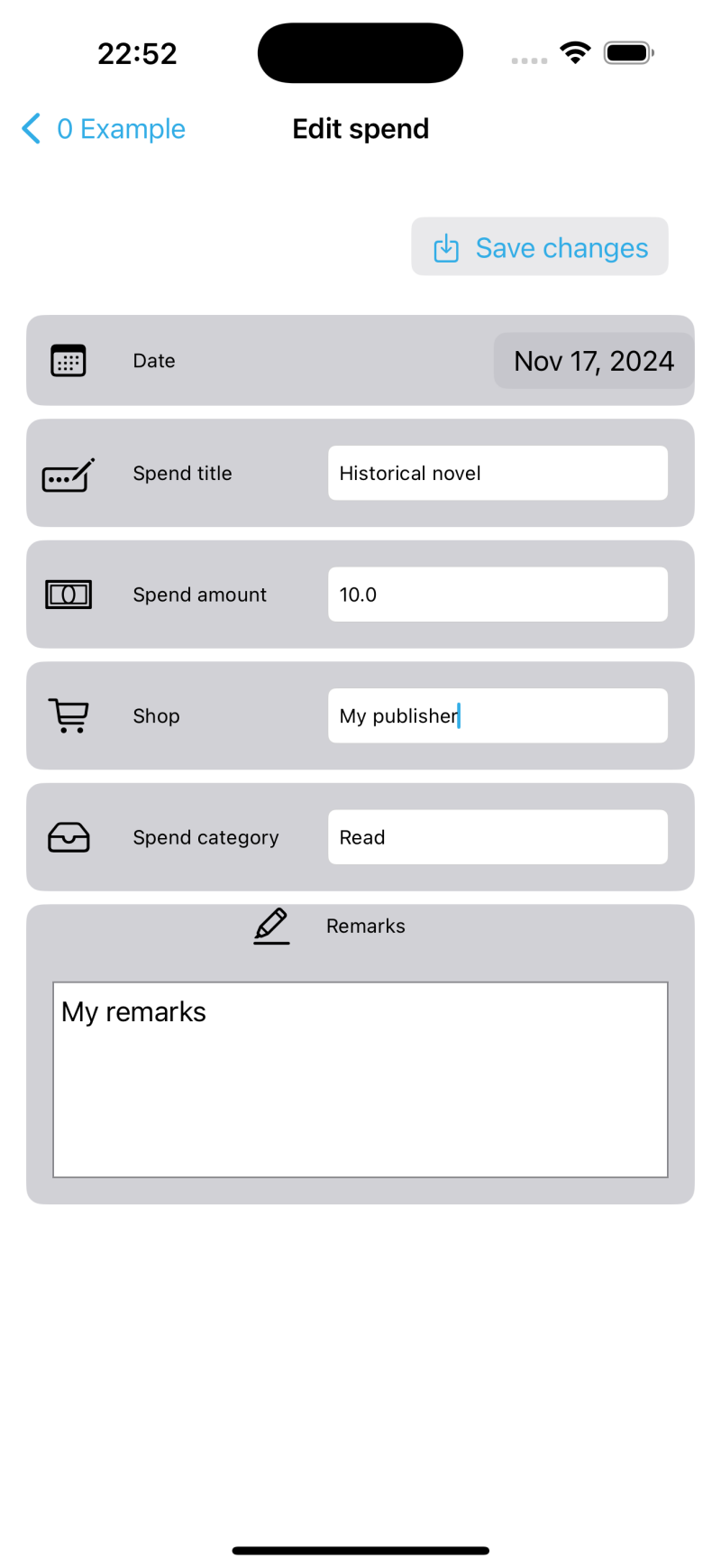 Create groups like e.g. months and simply enter a title for the spend and the amount. You can add additional information like shop name, category and remarks.