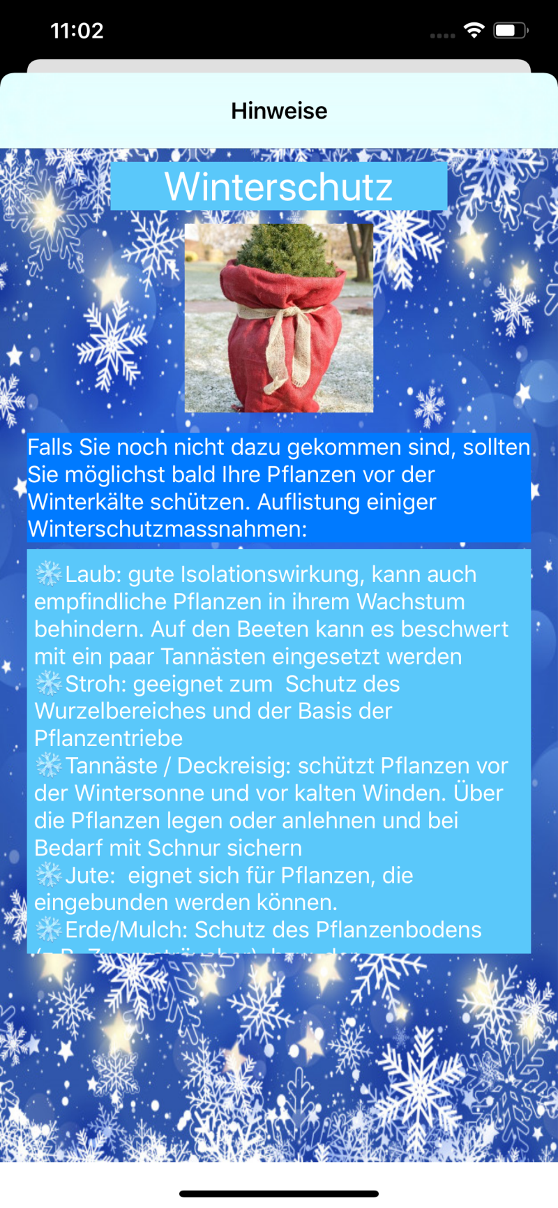Geht es Ihnen so wie mir? Einige Pflanzen muss man regelmässig düngen oder vor Krankheiten schützen und dies in regelmässigen Abständen. Aber wann war die letzte Düngung? Mein Gartentagebuch hilft Ihnen, einen besseren Überblick zu behalten. Dabei fokussiert diese App auf die wichtigsten Gartentätigkeiten Standortwahl, Boden- und Pflanzenpflege (Düngen, Schneiden, Pflanzen- und Winterschutz).