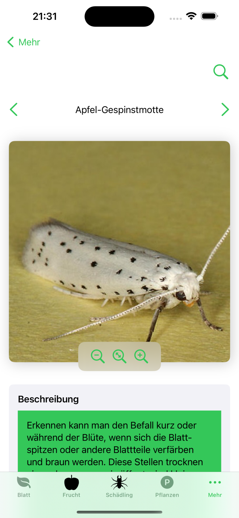 Schiessen oder laden Sie ein Foto des befallenen Blattes, der Frucht oder des Insekts und die App erkennt die Pflanzenkrankheit bzw. den Schädling. Anschliessend werden die Beschreibung und das Bild geladen, damit Sie überprüfen können, ob die erkannte Krankheit oder der erkannte Schädling korrekt ist. Vorschläge zur Vorbeugung und Bekämpfung des erkannten Problems werden geliefert.