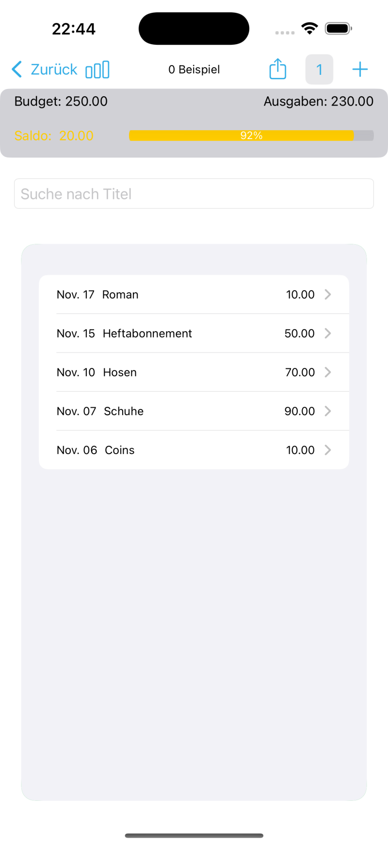 Definieren Sie einen Anfangssaldo und die App berechnet den verbleibenden Betrag automatisch. Es werden auch alle Ausgaben zusammengezählt.