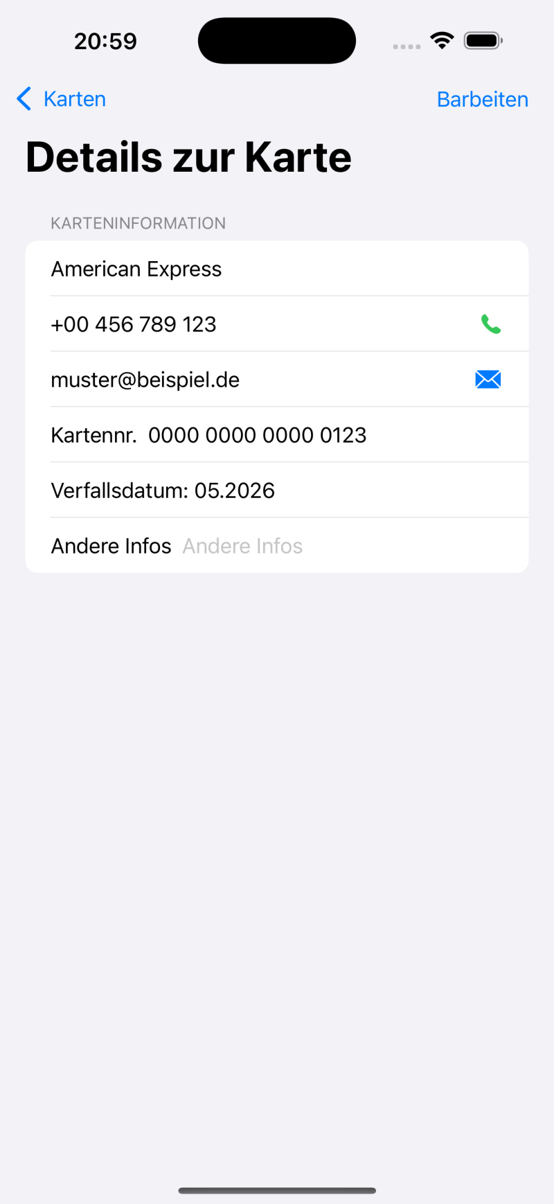 Sie können direkt von Ihrer App aus einen Anruf starten oder eine E-Mail senden. Die E-Mail ist mit einem vordefinierten Text versehen.