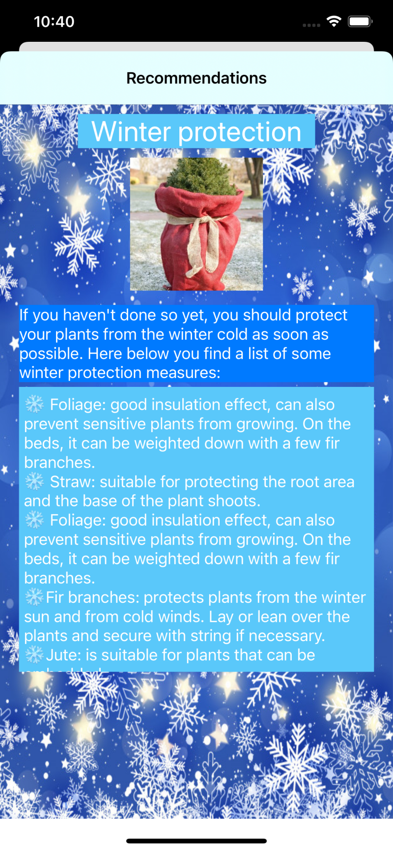 Are you like me? Some plants have to be fertilized or protected from diseases at regular intervals. But when was the last fertilization? My garden diary helps you keep a better overview. In doing so, this app focuses on the most important garden activities like fertilizing, pruning, plant protection. Conveniently create your plants from the built-in encyclopedia, and maintain the dates according to your needs.
