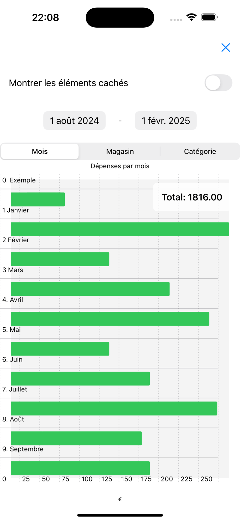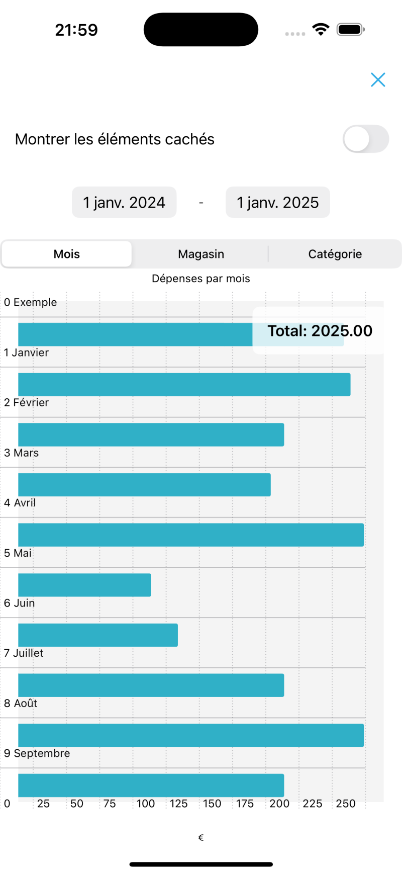 Les dépenses au sein d'un groupe peuvent être visualisées à l'aide d'un graphique soit par date, catégorie ou boutique.